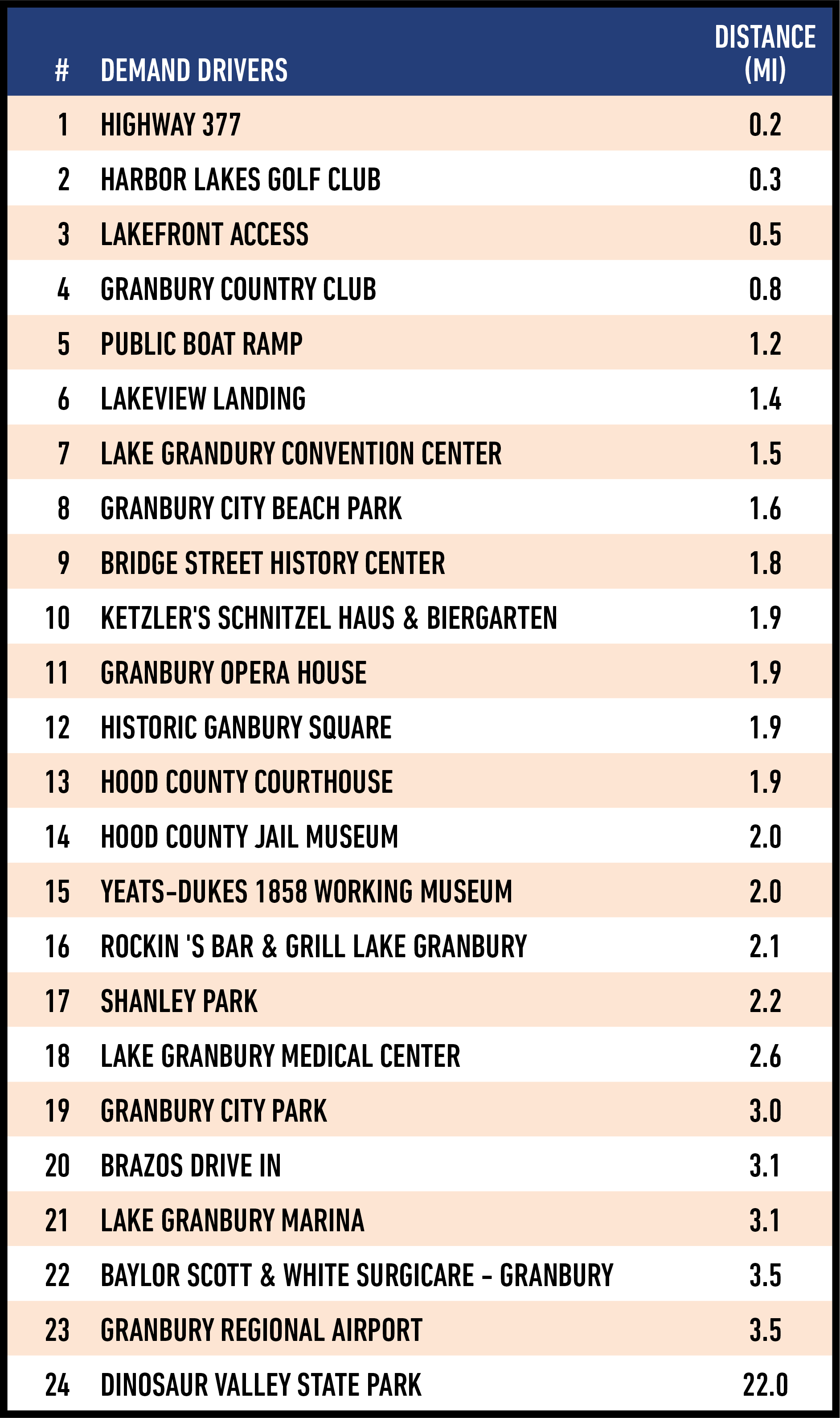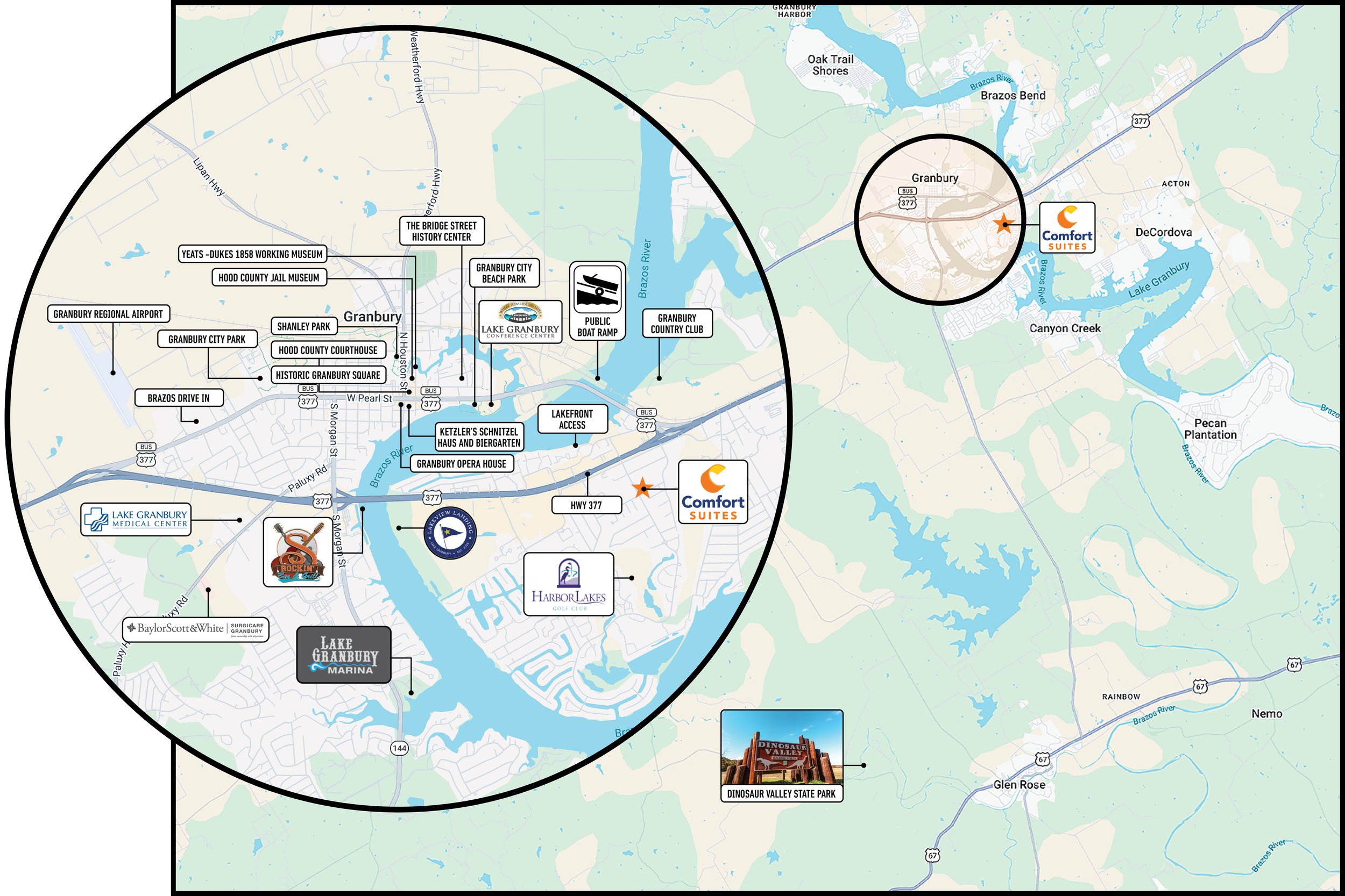 The Comfort Suites is situated in a prime location under five minutes away from Lake Granbury and Granbury City Beach Park, two of the region’s premier attractions. Furthermore, it is positioned a few streets over from Highway 377, providing the Hotel with exceptional access to surrounding demand drivers. Some of these demand drivers include the Historic Granbury Square, Baylor Scott & White Surgicare - Granbury, and Lake Granbury Medical Center. Located roughly 35 miles southwest of Fort Worth, the Property uniquely serves both leisure guests from DFW and abroad.